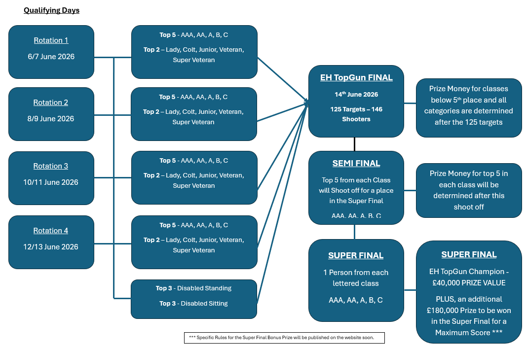 We have a minimum prize pot of £400,000 in cash and prizes which will be distributed across lettered classes & categories in the TopGun main event & sportrap. The flow diagram here shows the format of the TopGun main event.